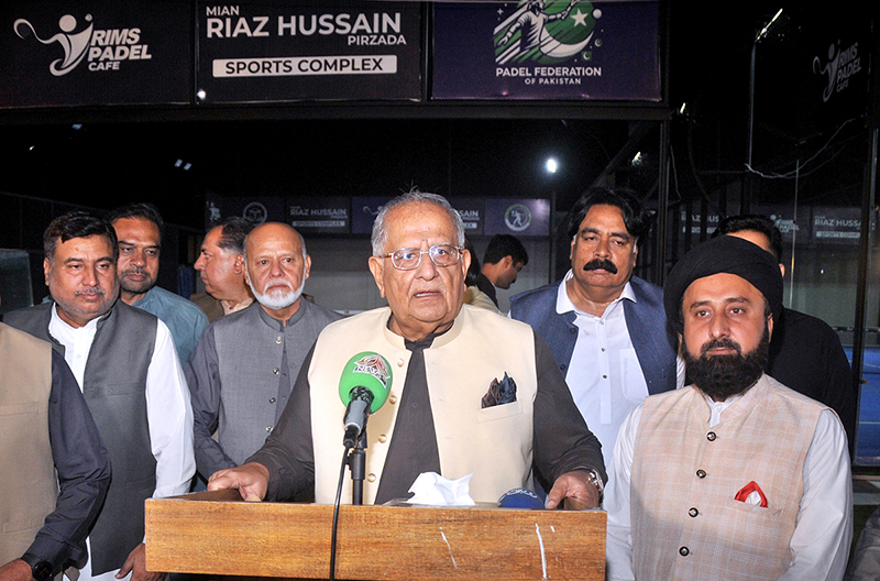 MULTAN: October 17 – Federal Minister for Housing and Works, Riaz Hussain Pirzada talking to the media after inaugurating the Riaz Hussain Pirzada Sports Complex at the Royal Institute of Medical Sciences. APP/QSM/ABB/FHA