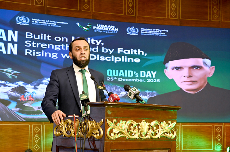 APP09-251225 ISLAMABAD: December 25 – APP10-251225 ISLAMABAD: December 25 – Federal Minister for Information and Broadcasting Attaullah Tarar addresses a ceremony marking the birth anniversary of the Founder of Pakistan, Quaid-e-Azam Muhammad Ali Jinnah, at the Convention Centre. APP/SAK/ABB