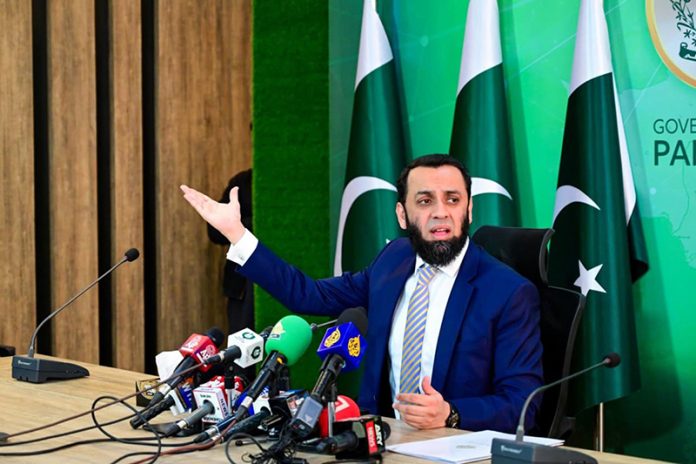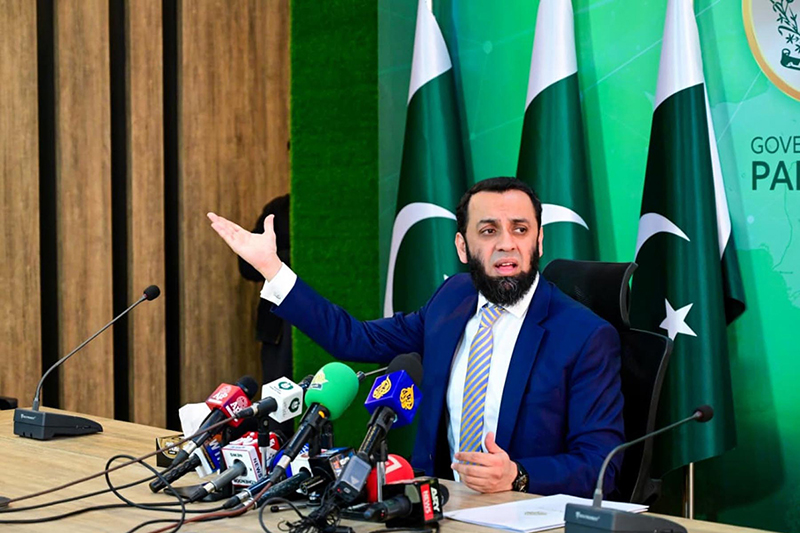Federal Minister for Information and Broadcasting, Attaullah Tarar addressing a press conference.