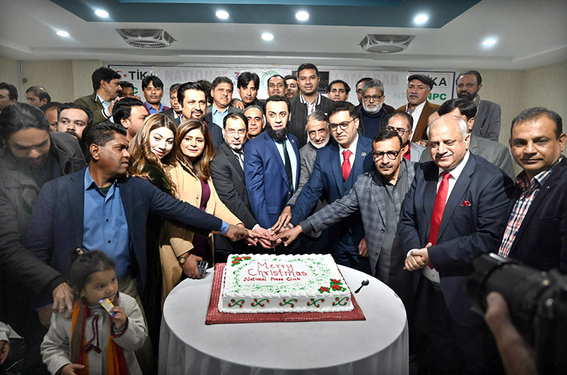 Federal Minister for Information and Broadcasting Attaullah Tarar, PIO Mobashir Hassan, Managing Director Associated Press of Pakistan Muhammad Asim Khichi, and Secretary General NPC Nayyar Ali join members of the Christian community in cutting a Christmas cake during a Christmas Eve ceremony organized by the National Press Club Islamabad, in collaboration with Medic Galleria and the Zakat Foundation of America.