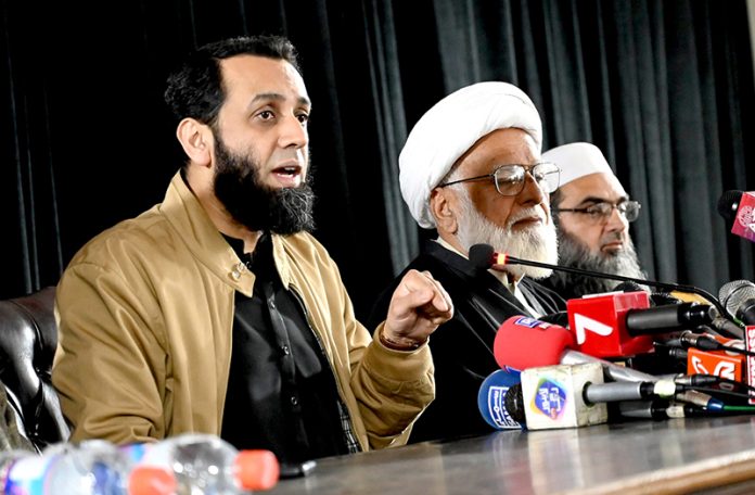 – Federal Minister for Information and Broadcasting Attaullah Tarar with Dr. Muhammad Hassan Akbar talking to the media at Jamia Mahnaj-ul-Hasan in Johar Town.