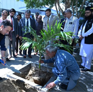 Federal Minister for Maritime Affairs, Junaid Anwar Chaudhry is planting a tree at the premises of Pakistan National Shipping Corporation head Office