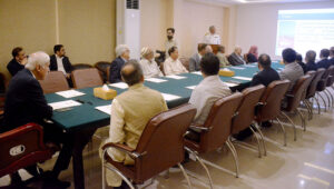 Federal Minister for Maritime Affairs Qaiser Ahmed Sheikh chairing a meeting with the Pakistan Maritime Academy officers during his visit to the PMA.