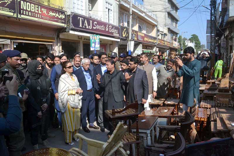 CHINIOT: February 22 – Federal Minister for Maritime Affairs, Qasir Ahmad Sheikh, addresses furniture traders and listens to their concerns at the furniture market.