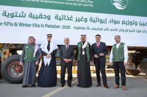 Federal Minister for National Food Security and Research Rana Tanveer Hussain in a group photo with Saudi Ambassador Nawaf Bin Said Al-Maliki at a ceremony as KSrelief launches major initiative to provide shelter NFIs and Winter Kits in Pakistan 2025 at Pakistan Sports Complex
