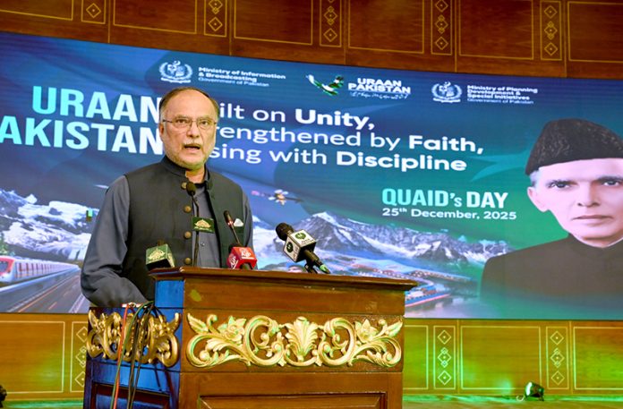 APP11-251225 ISLAMABAD: December 25 –APP12-251225 ISLAMABAD: December 25 – Federal Minister for Planning Development & Special Initiatives Ahsan Iqbal addresses a ceremony marking the birth anniversary of the Founder of Pakistan, Quaid-e-Azam Muhammad Ali Jinnah, at the Convention Centre. APP/SAK/ABB