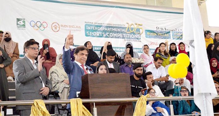 Federal Minister for Railways, Muhammad Hanif Abbasi inaugurating the FJWU Internal Sports Competition 2025