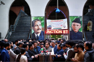 Federal Minister for Railways Muhammad Hanif Abbasi talking the media persons during press conference at Lahore Railway Station