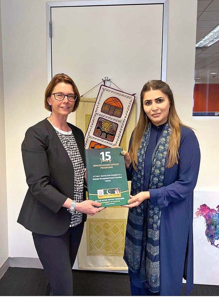 Federal Minister PA&SS and Chairperson Benazir Income Support Programme, Shazia Marri presents book titled “15 Years of Benazir Income Support Programme: 15 Years’ Journey from Inception to a Globally Recognized Social Protection Vehicle” to World Bank’s Regional Head of Social Protection & Acting Director for Digital Development in Europe and Central Asia, Ms. Nicole Klingen, at World Bank Headquarters