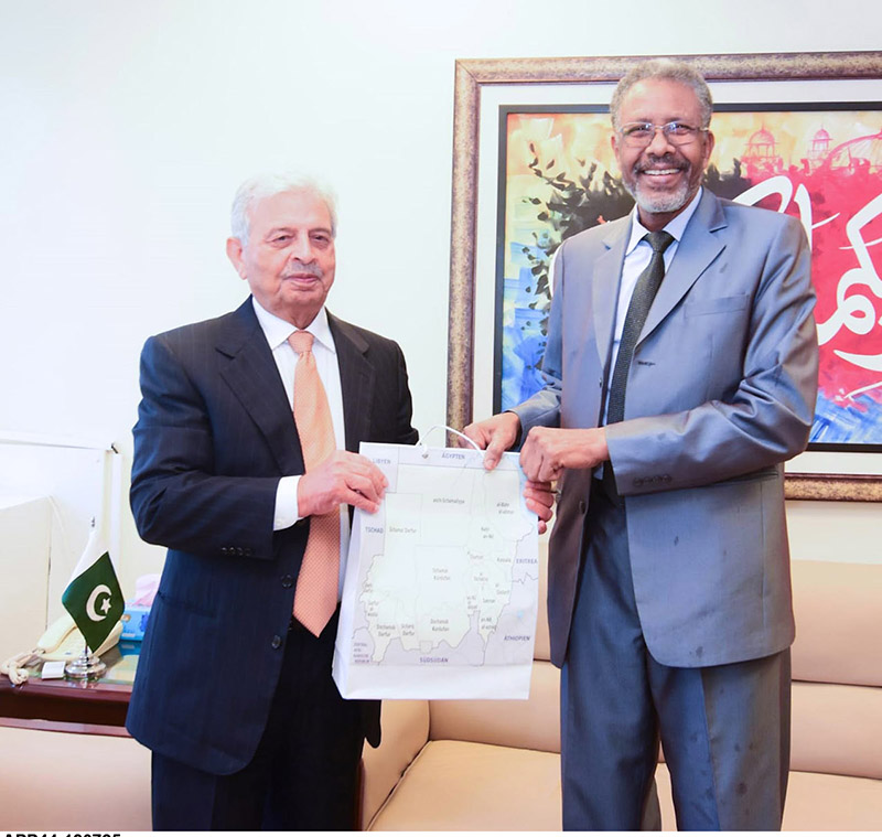 Federal Minister Rana Tanveer Hussain and Sudanese Ambassador H.E. Salih Mohamed Ahmed Mohamed Siddig exchange souvenirs after bilateral meeting.