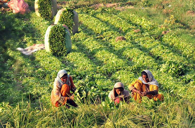 Female farmers harvest fresh spinach from their field to sell in nearby markets and earn their daily income