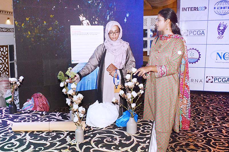 Female visitor watching cotton plants during the ceremony of World Cotton Day