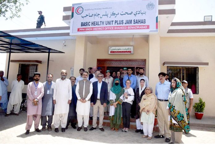 First Lady Aseefa Bhutto Zardari, World Bank Managing Director Ms. Anna Bjerde, and Sindh Chief Minister Syed Murad Ali Shah pose for a group photo during their visit to the Basic Health Unit (BHU) in Jam Sahab