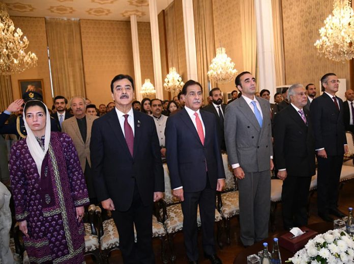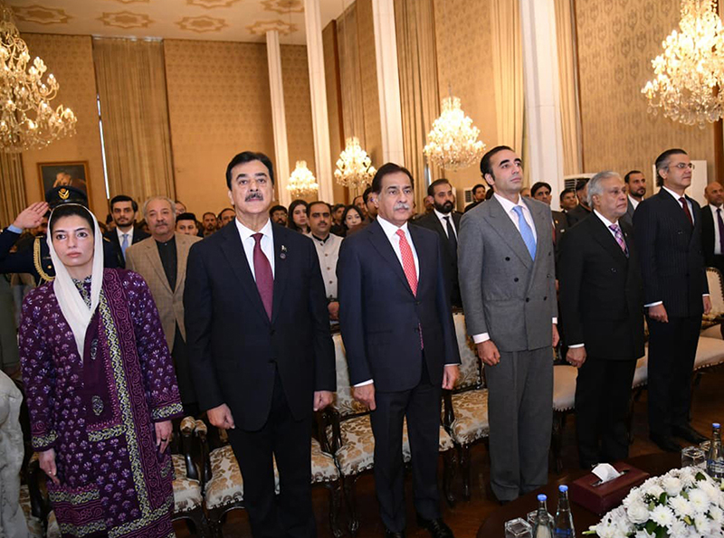 First Lady Bibi Aseefa Bhutto Zardari, Chairman Senate Syed Yousuf Raza Gilani, Speaker National Assembly Sardar Ayaz Sadiq, Chairman PPP Bilawal Bhutto Zardari and Deputy Prime Minister and Foreign Minister Muhammad Ishaq Dar at the oath taking ceremony of the Chief Justice of the Constitutional Court at Aiwan e Sadr.