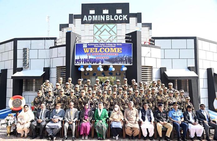 First Lady Bibi Aseefa Bhutto Zardari in a group photo with the students and teachers at the 5th passing out parade and annual Parents’ Day ceremony of Bakhtawar Cadet College for Girls.