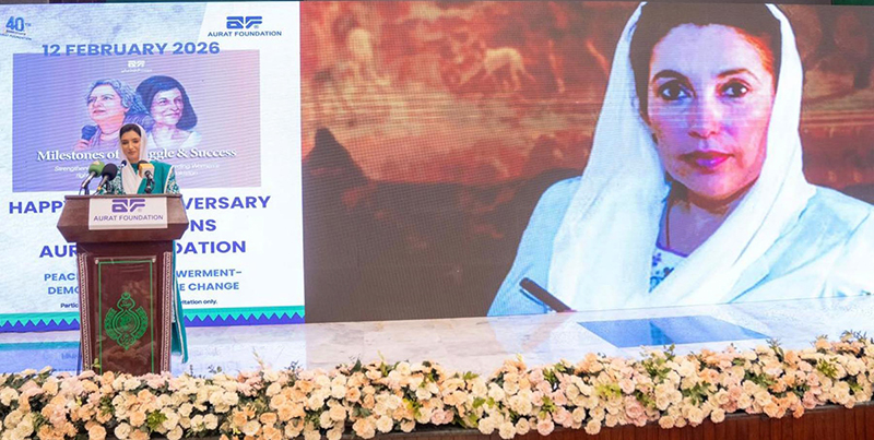 KARACHI: February 12 – First Lady & MNA Bibi Aseefa Bhutto Zardari addresses the 40th anniversary ceremony of Aurat Foundation at the CM House. APP/ABB