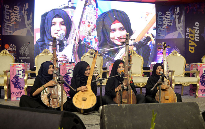 Folk female singers performing Shah Abdul Latif Bhitai’s poetry during the 11th Ayaz Mela organized by Khana Badosh Writers’ Café at Sindh Museum.