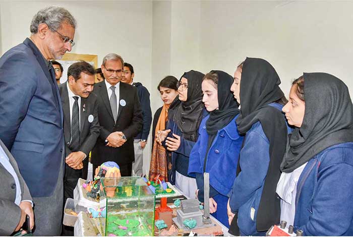 Former Prime Minister Shahid Khaqan Abbasi along with Chaudhary Muhammad Akram keenly viewing Science & Arts Exhibition of Punjab College of Commerce.