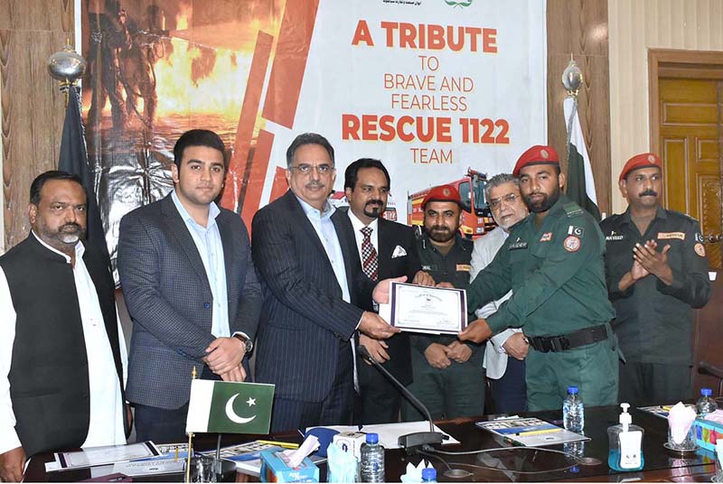 Chamber of Commerce and Industry President Abdul Ghafoor Malik are distributing Certificates among the Rescue 1122 staffers On their best services