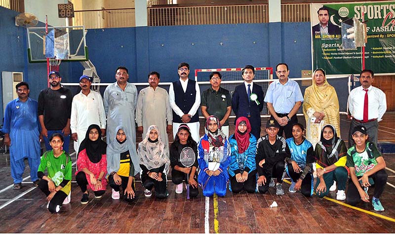 SARGODHA: August 14 – Group photo of Additional Deputy Commissioner Revenue Muhammad Mohsin Salahuddin with players during an event organized by Sports Department at Gymnasium on the occasion of 77th Independence Day celebration. APP/HSD/TZD/ZID