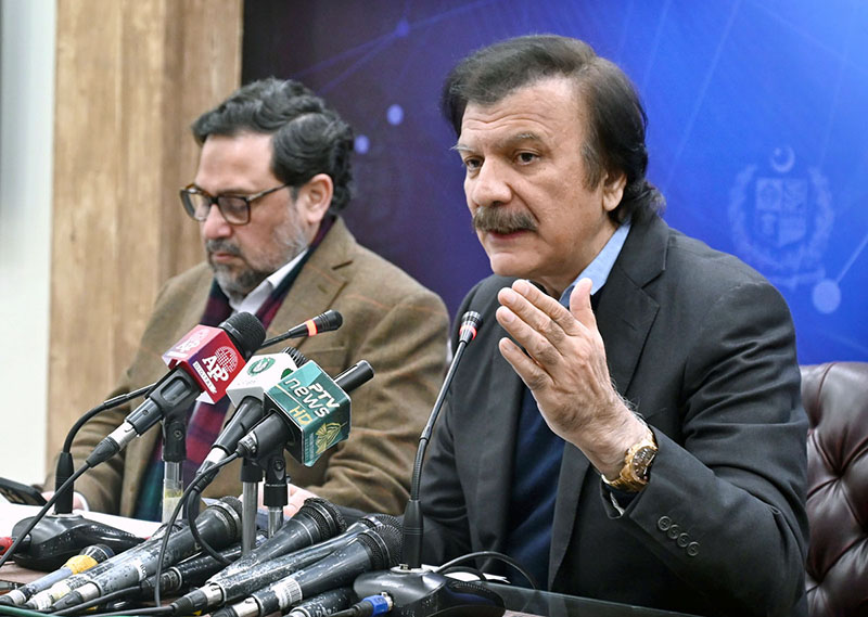 Special Assistant to the Prime Minister (SAPM) Haroon Akhtar Khan addressing a press conference at PID Media Center.