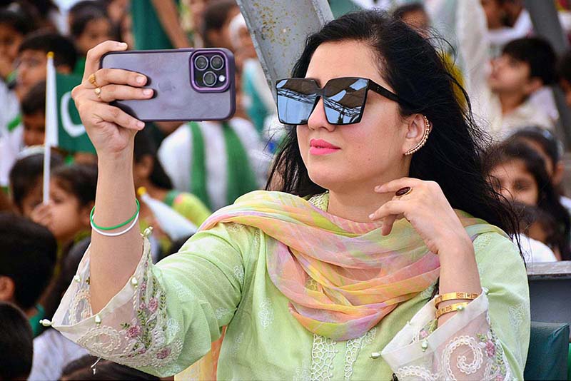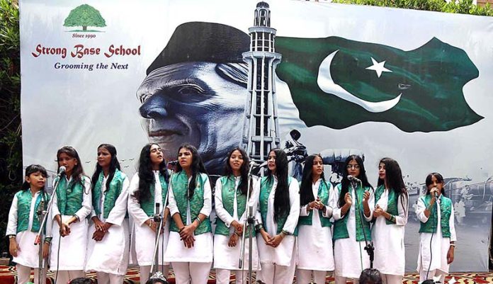 Students are singing National song during the ceremony organized at Radio Pakistan Road on the occasion of 77th Independence Day celebration