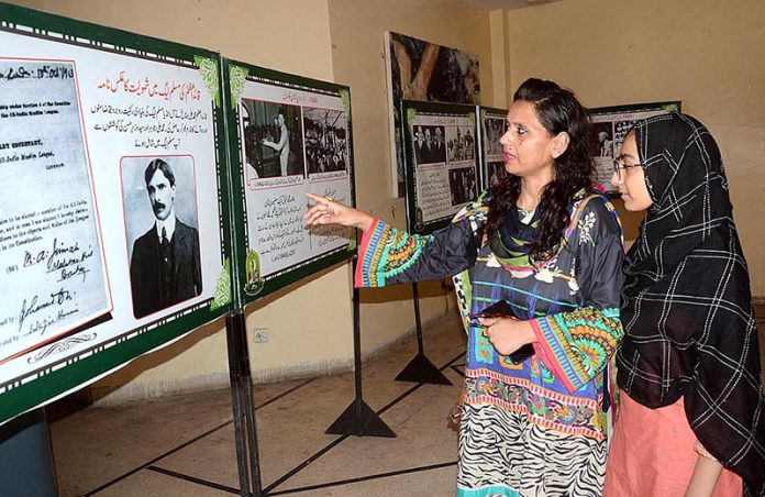 Visitor women watching the Photographic Exhibition of Quaid e Azam in connection to the upcoming independence day at the Arts Council