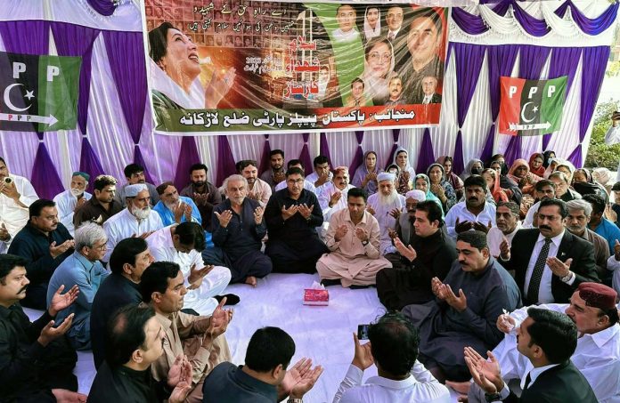 General Secretary PPP Larkana Division, Abdul Fattah Bhutto, along with other PPP district officials, offering Fateha on the 18th death anniversary of Karsaz Martyrs at Garhi Khuda Bakhsh.