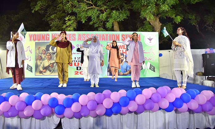 Girls performing in a tableau to pay tribute to Pakistan Armed Forces during function in connection with International Nurses Day celebrations at Press Club.