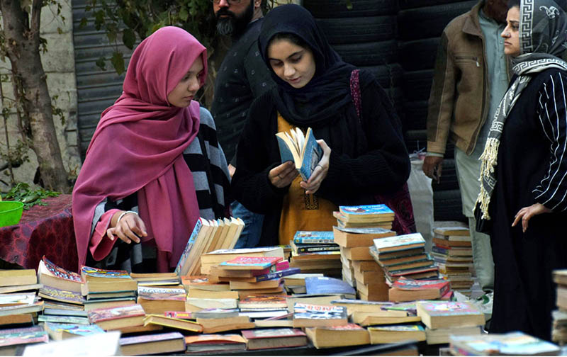 HomePhotosGeneral Coverage PhotosGirls selecting and buying old books from a stall on Mall Road