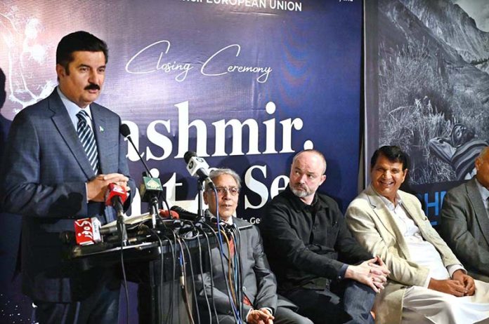 ISLAMABAD: January 28 – Federal Minister for Kashmir Affairs and Gilgit-Baltistan, and States & Frontier Regions, Engr. Amir Muqam, addresses the closing ceremony of the photography exhibition and book launch titled “KASHMIR, WAIT & SEE” by Shah Zaman Baloch and internationally renowned photographer Cédric Gerbehaye at PNCA. APP/SMR/MAF/TZD/SSH