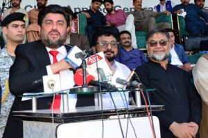 Governor Sindh Kamran Khan Tessori addresses participants at the Grand Entry Test for the Governor Sindh IT Initiative Program 2024, held at Niaz Stadium in the city.