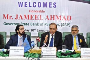 Governor State Bank, Jameel Ahmed addressing the chamber of commerce and industry members at MCCI