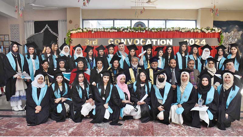 Graduate students pose for group photo with DG, FDE Tanveer Ahmed Principal Prof Rozina Faheem, after convocation at FG Home Economics College F11/1