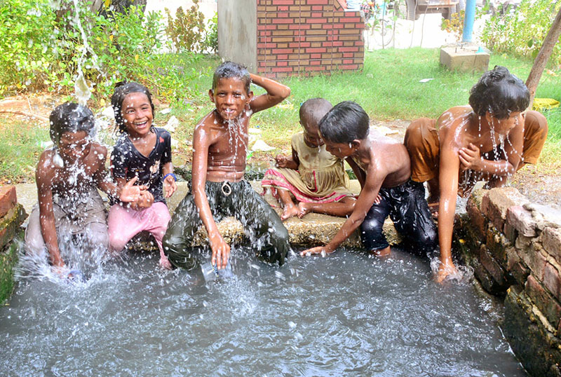 Gypsy children enjoying bathing to get relief from hot and humid weather in the city.