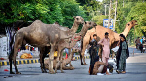 Gypsy family selling the camel milk to customers at roadside setup in the Provincial Capital
