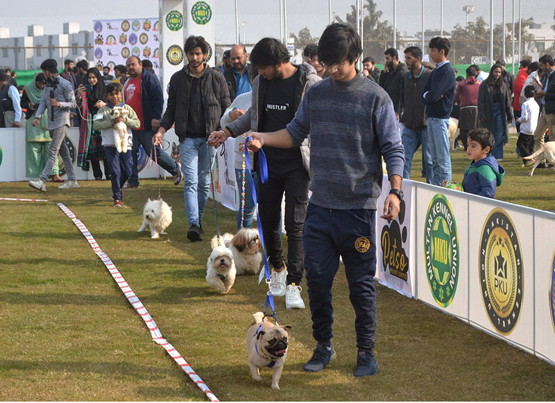 Handlers running with Dogs during the international all-breed championship Dog Show in collaboration with Pakistan Kennel Union at DHA