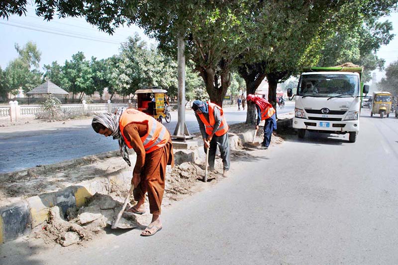 Highway Department workers are cleaning green belt on Hasilpur Main road.
