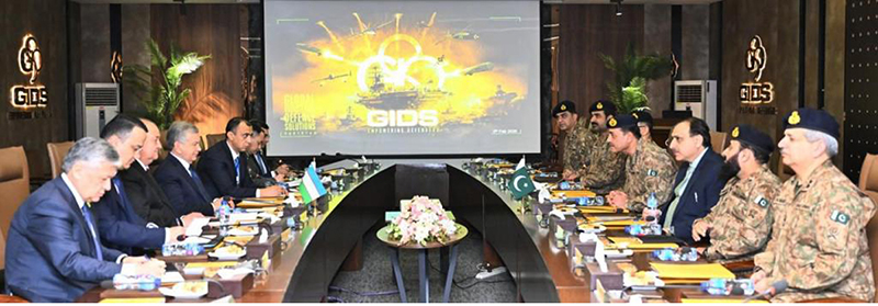 His Excellency Shavkat Mirziyoyev, President of the Republic of Uzbekistan, along with senior ministers paid an official visit to Global Industrial & Defence Solutions (GIDS) as part of his visit to Pakistan. Field Marshal Syed Asim Munir, NI (M), HJ, COAS & CDF briefs the President on the diverse portfolio of GIDS encompassing advanced defence solutions, industrial capabilities, and technological innovations.
