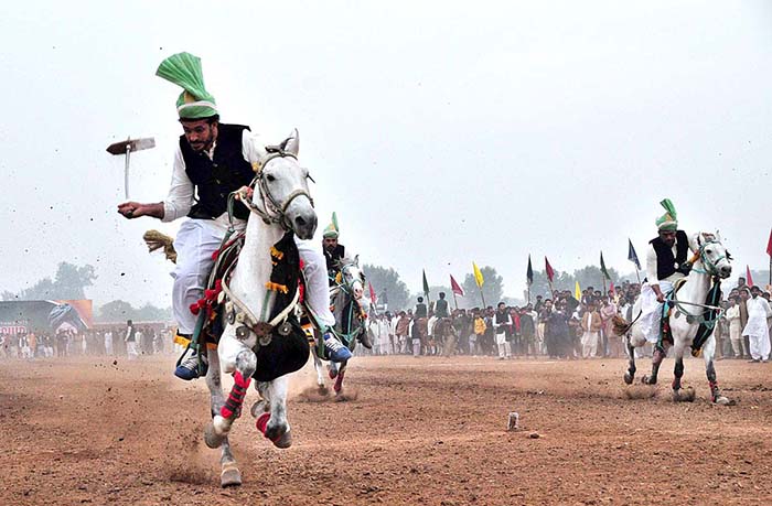 Horse riders are participating in Tent-Pegging competition organized by Qutab Shahi Awan Tent Pegging Club Soon Valley at Mela Mandi ground.