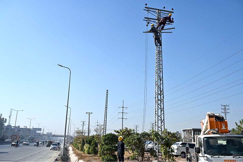 IESCO workers are busy installing electricity wires on an electric pole near IJP Road in the Federal Capital