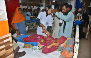 HYDERABAD: April 17 - Injured passengers being treated in Civil Hospital who sustain injuries in road accident between passengers coach and oil tanker, resulting 07 passengers died and 15 injured in incident at Manjhand City, Sehwan Road.