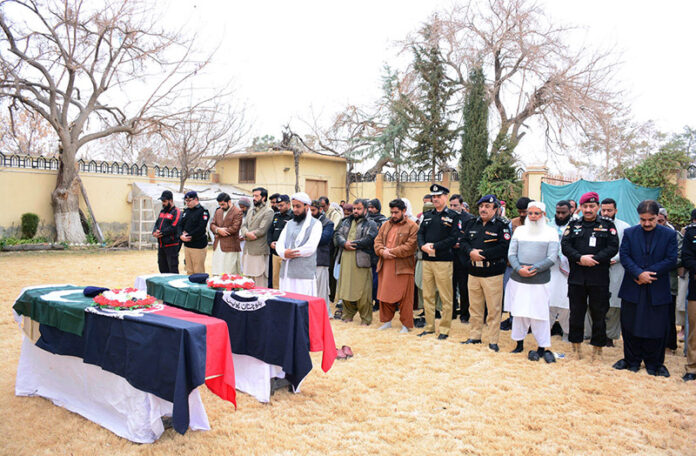QUETTA: February 21 – Inspector General of Police Balochistan, Moazzam Jah Ansari, along with other officers, pay tribute to the personnels martyred in attack of Shaban area. APP/MNN/ABB/FHA