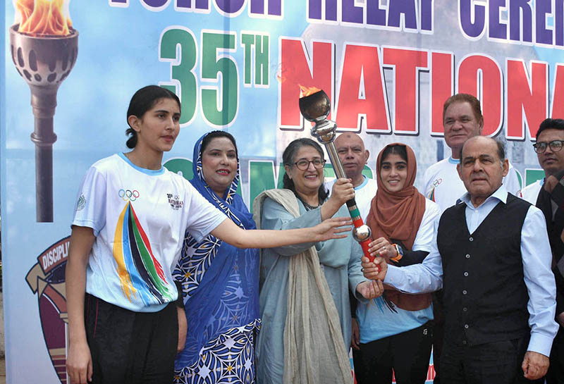 Khwaja Idrees, representing the Punjab Olympic Association, hands over the torch to athletes Vice Chancellor Dr. Uzma Qureshi and Dr. Sameera Sattarat during the 35th National Games torch relay ceremony at Lahore College for Women.