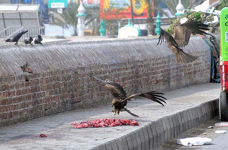 September 13 - Kite birds picking the piece of meat thrown by the people for mercy at the roadside.