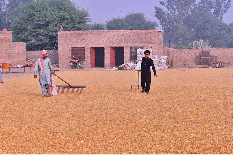 Laborers are busy in spreading corn seeds for drying purposes at their Workplace