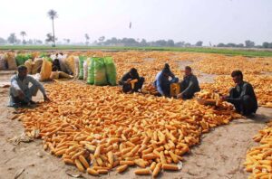 Laborers engaged in packing maze in suburb of Bahawalpur which is being loaded on tractor trolley and transport them to grain market and cooking oil factories