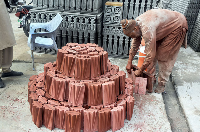 Labourer busy displaying tuff tiles at IJP Road in the Federal Capital.