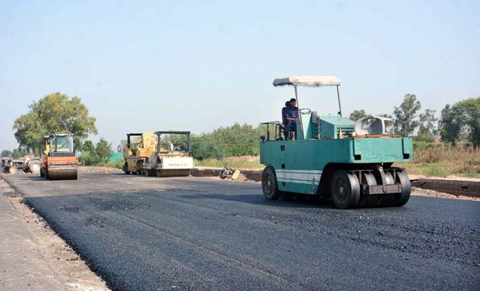 Labourers are busy in construction work of Sargodha Road with the help of heavy machinery during development work in the city.