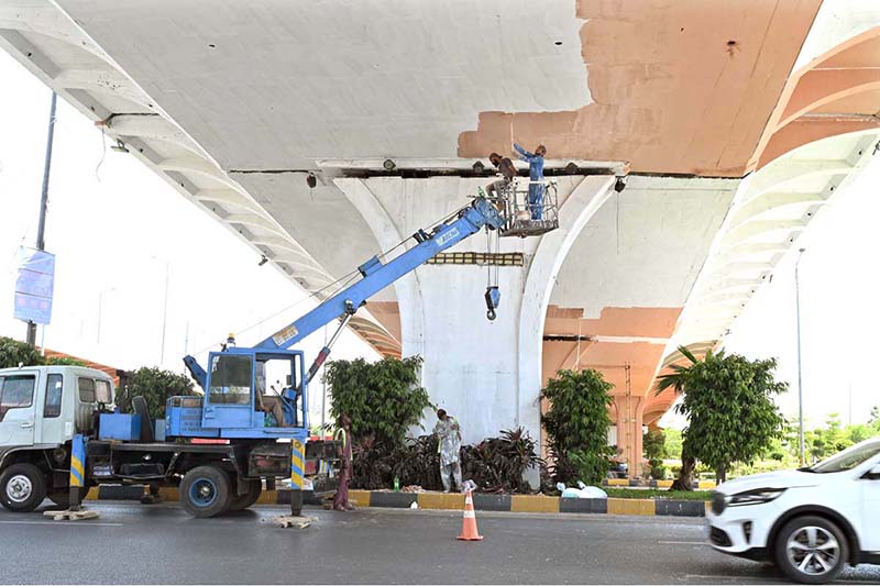 Labourers are busy paint the bridge at Peshawar Morr Interchange in the Federal Capital